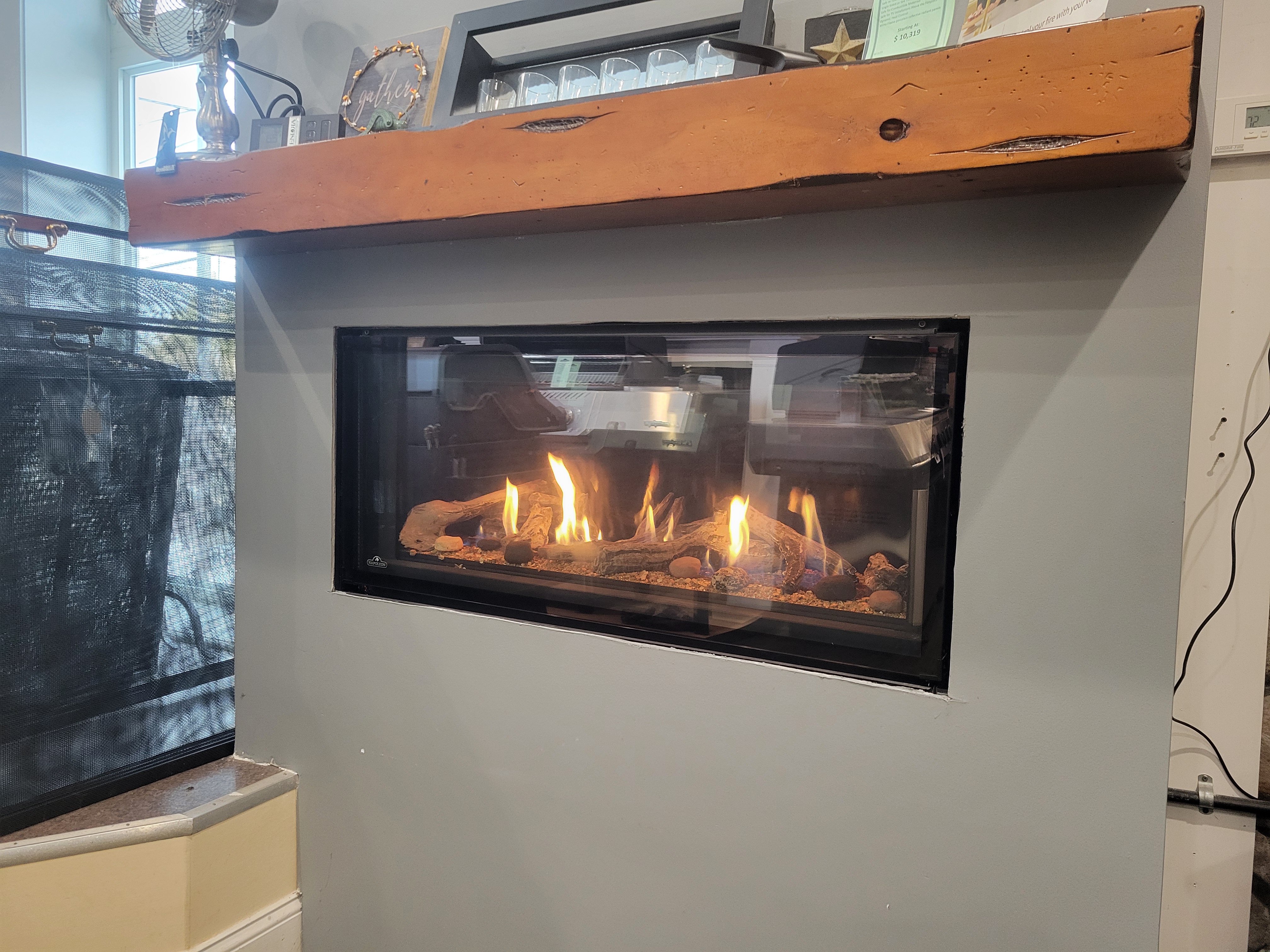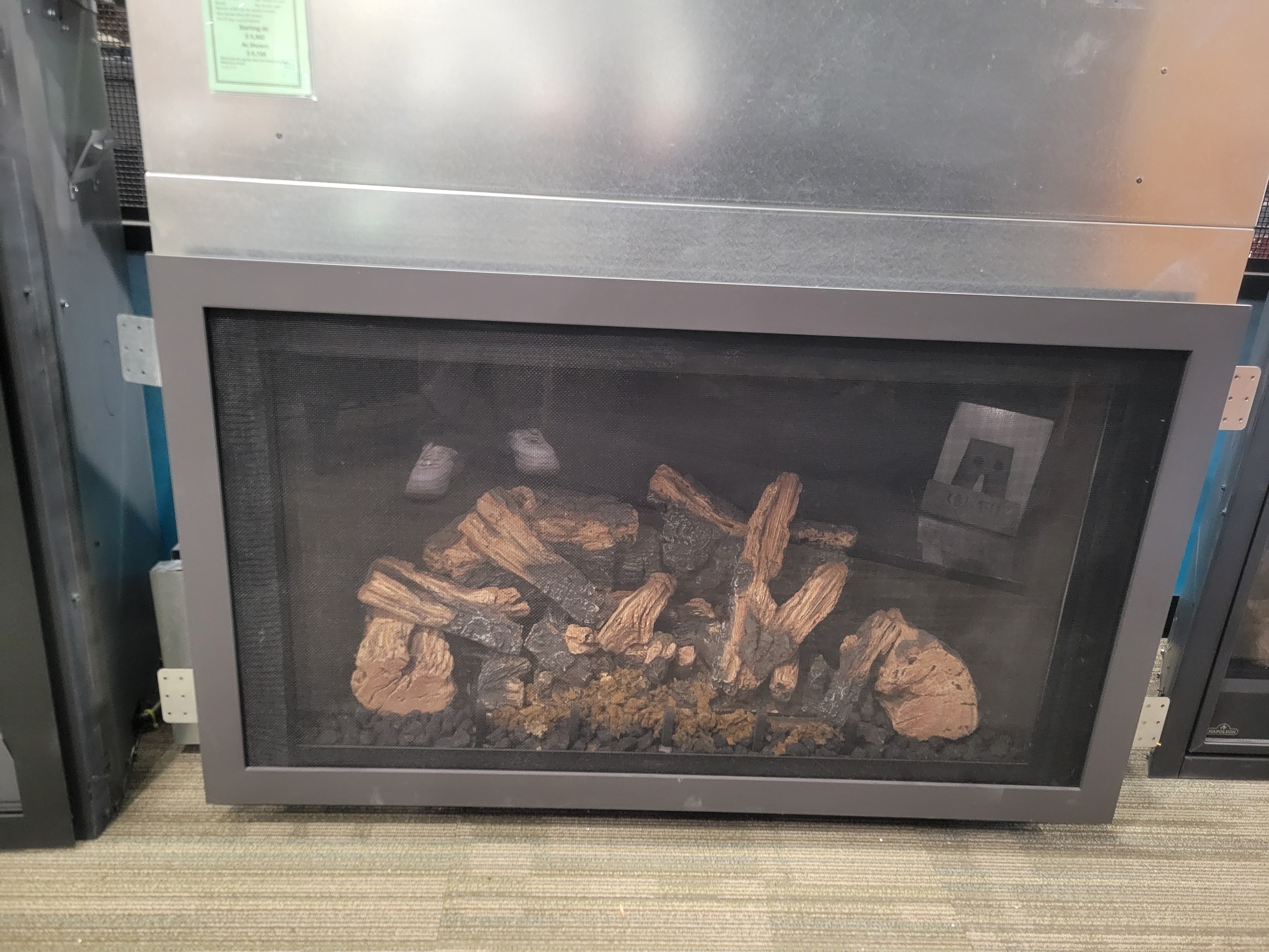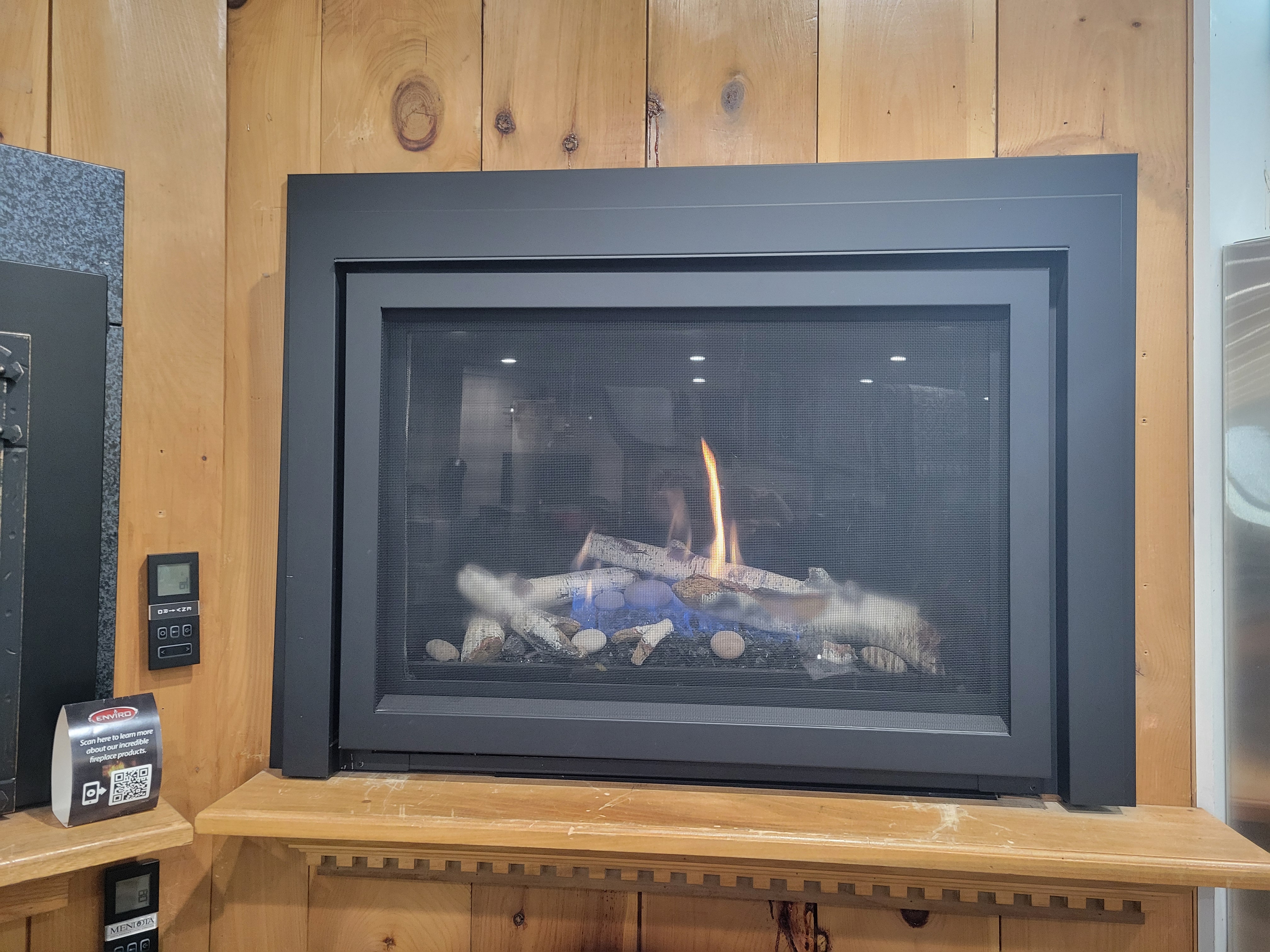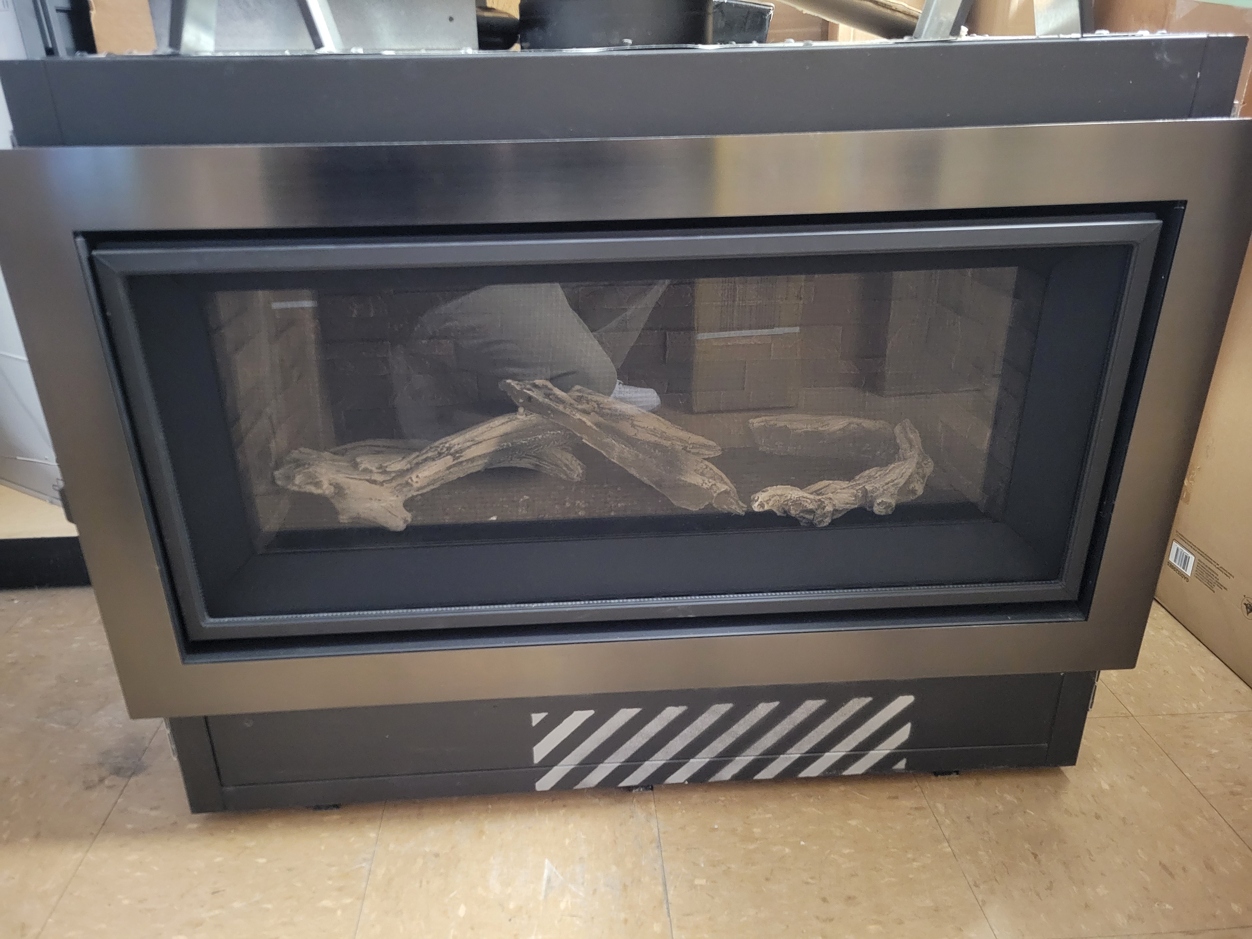 Enviro C34 Linear Gas Fireplace Burn Display- Driftwood Log Set with Ledgestone Interior Liner- Black Nickel Finishing Trim- Natural Gas ONLY- **$2800** –